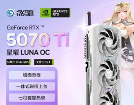 影驰 RTX5070Ti星曜LUNA OC搭载全新NVIDIA架构与DLSS 4技术,配备16GB高速GDDR7显存,性能强劲流畅,轻松驾驭4K高画质游戏与专业