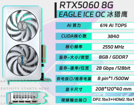 技嘉 RTX 5060 8G 显卡基于 NVIDIA Ada Lovelace 架构(假设为下一代架构命名),搭载 8GB GDDR6 显存,显存位宽 128-