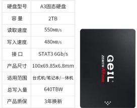 GeIL A3 2TB SSD 采用标准M.2 2280规格,适配台式机、笔记本及扩展阵列设备,结构...