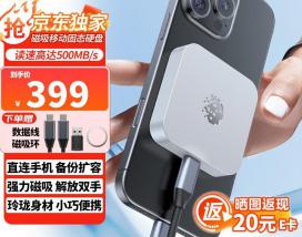 梵想 PS500 1TB移动固态硬盘,拥有高达500MB/s的传输速度,采用磁吸设计,轻巧便携,支持手机直连和笔记本外接,是数据存储与传输的理想选择。原价399